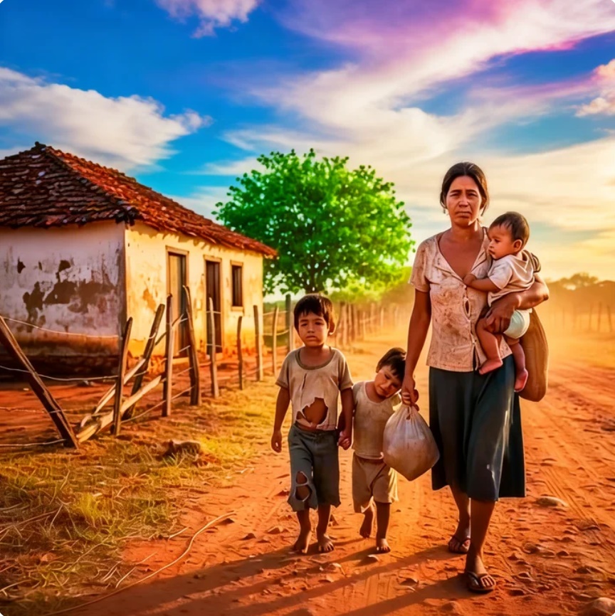 Sem destino certo, Josefina caminhou com os filhos pelas ruas ainda úmidas do amanhecer. O céu cinzento parecia refletir o peso que carregava.