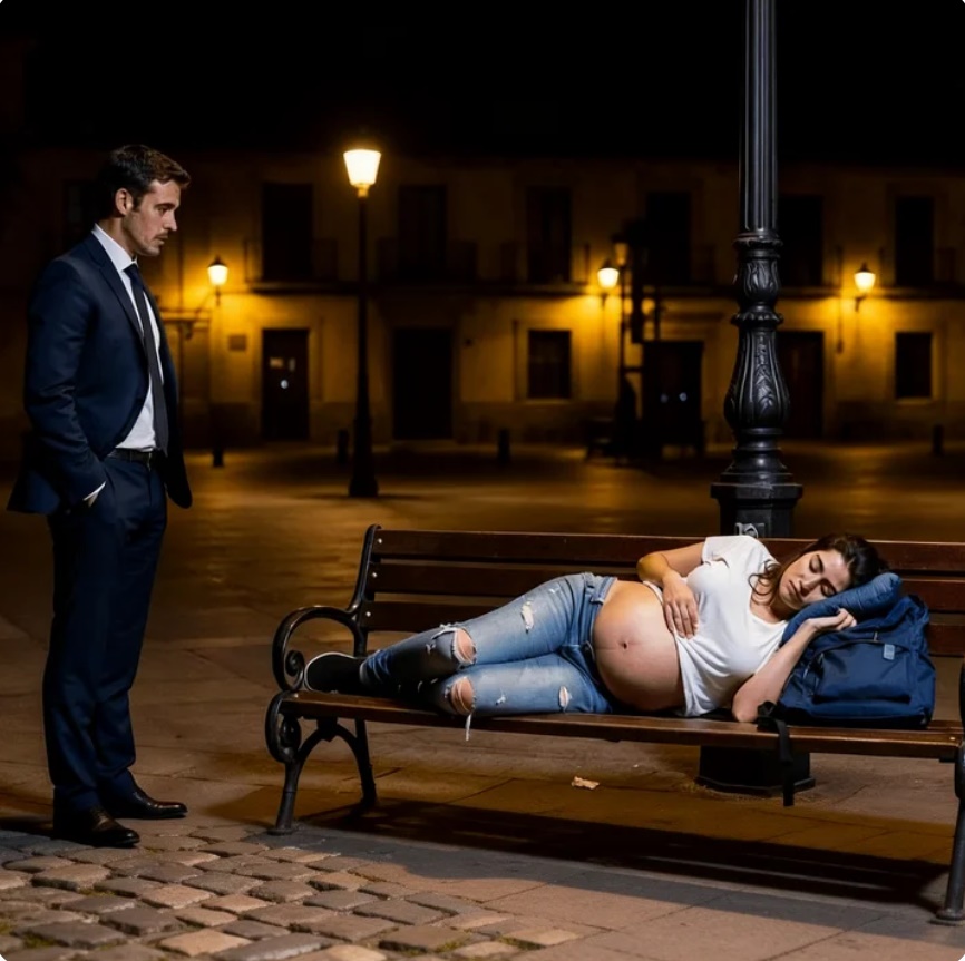 Al pasar por la plaza, vio la silueta encogida en el banco. Se detuvo. No era solo una chica sin hogar. Había algo en la forma en que protegía su vientre.