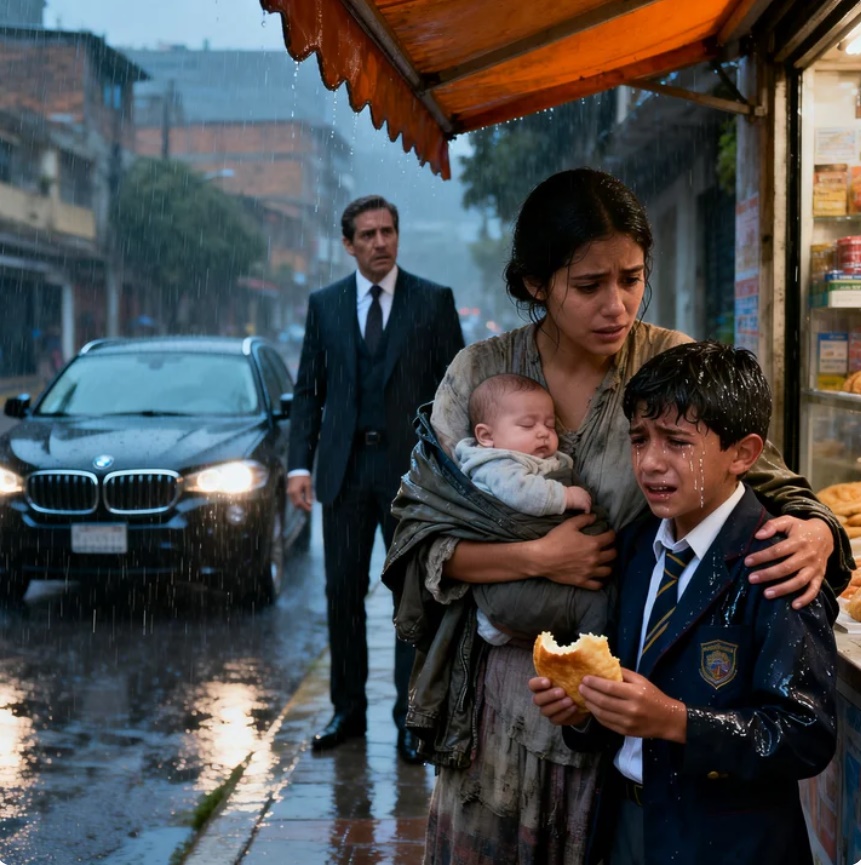 Estaba a unos pasos de distancia, perdido en la lluvia como una hoja arrastrada por el viento. Su uniforme caro estaba completamente empapado, sus zapatos elegantes ahora cubiertos de barro. Temblaba sin control, abrazándose a sí mismo, con los ojos rojos —de lluvia o de llanto— imposibles de distinguir.
