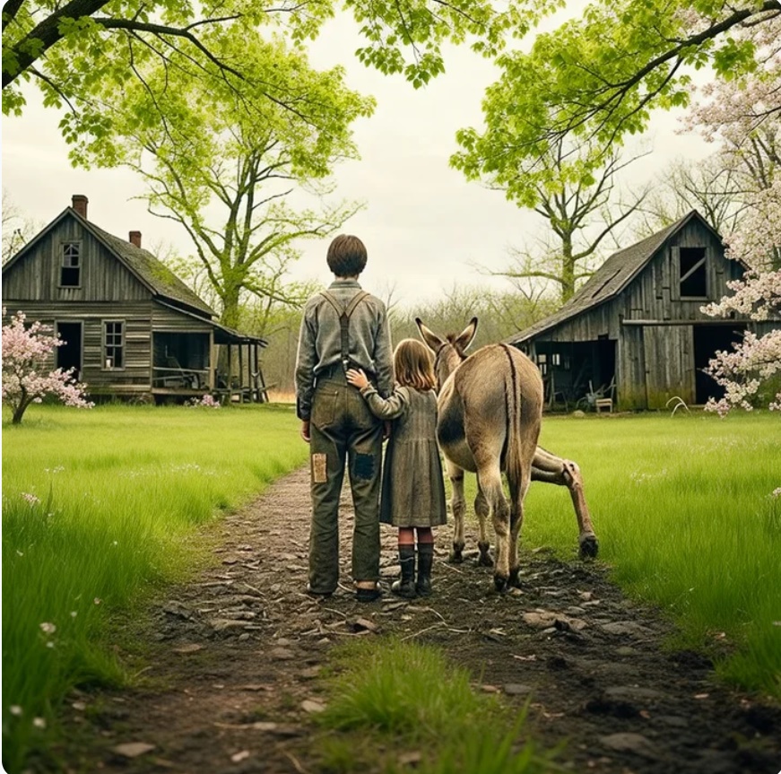 exhalando su último aliento y un granero inclinado que parecía a punto de rendirse a la gravedad. El burro cojo