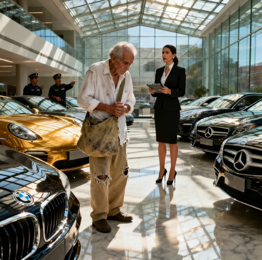 Aquella mañana, la luz suave del sol caía sobre los enormes paneles de vidrio del showroom de autos más lujoso de la ciudad, haciendo que todo el espacio pareciera cubierto por un resplandor dorado, tan brillante como frío. En el interior, todo era perfecto hasta el punto de volverse casi inhumano: el suelo de mármol pulido reflejaba cada paso, los autos nuevos se alineaban como obras de arte impecables, y las personas, vestidas con elegancia, hablaban con una cortesía distante, casi mecánica.