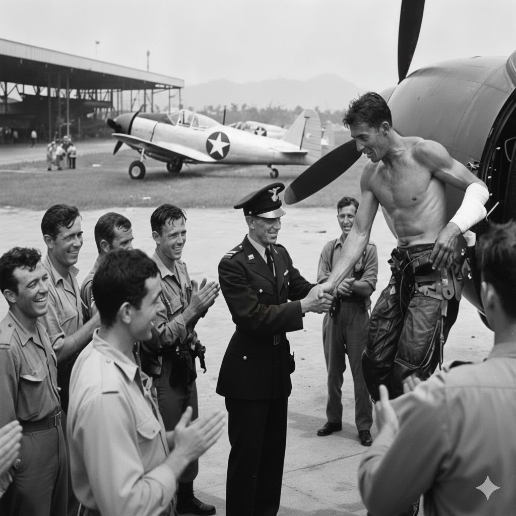 Cuando aterrizó, los pilotos americanos corrieron hacia él. Henderson, un texano pelirrojo, lo abrazó llorando.