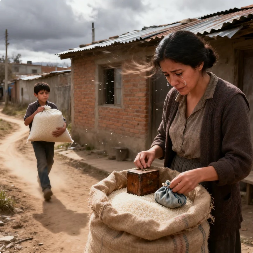 Después de un largo momento, se dio la vuelta y entró a su casa. Pensé que volvería con solo un puñado de arroz, pero cuando regresó, traía una bolsa enorme, pesada, que debía pesar unos diez kilos. La colocó en mis manos con cuidado y me dijo, con voz baja y ligeramente temblorosa: