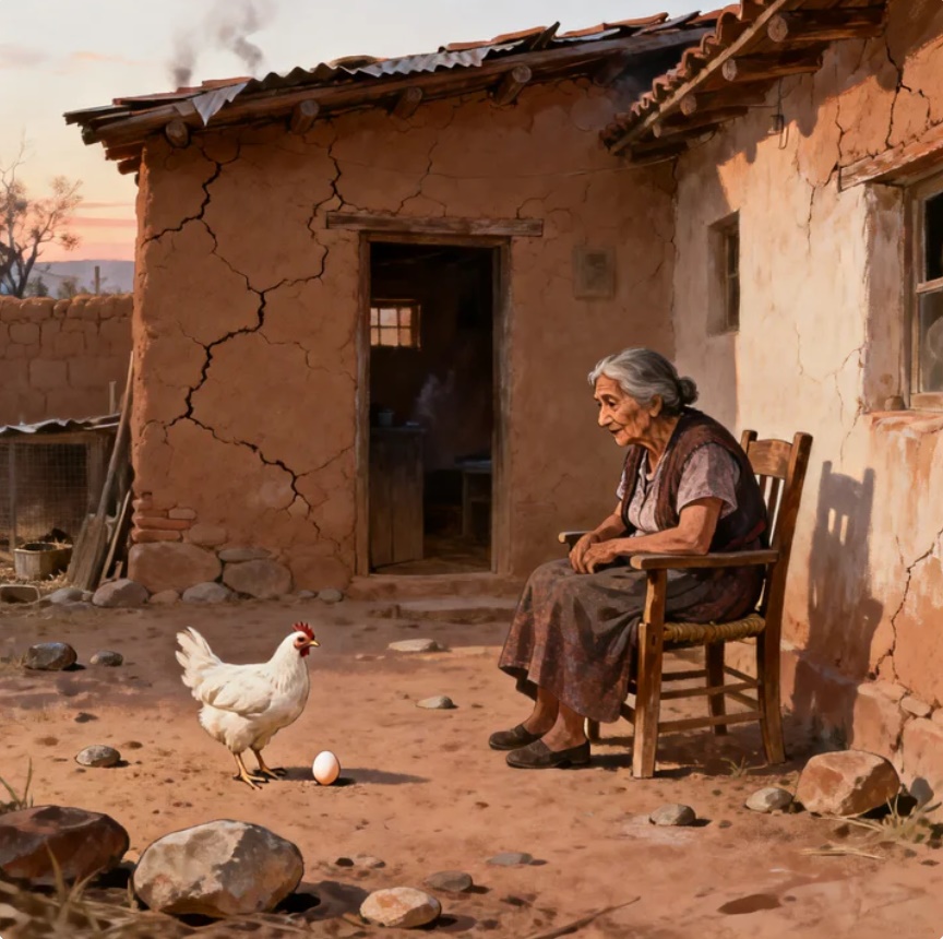 Doña Elvira tenía setenta y dos años y vivía en una pequeña casa de barro que siempre olía a humo viejo. El techo crujía cuando soplaba el viento y las paredes guardaban el frío de las noches largas. En el patio, entre la tierra seca y algunas piedras, solo quedaba una gallina blanca, flaca pero fiel.