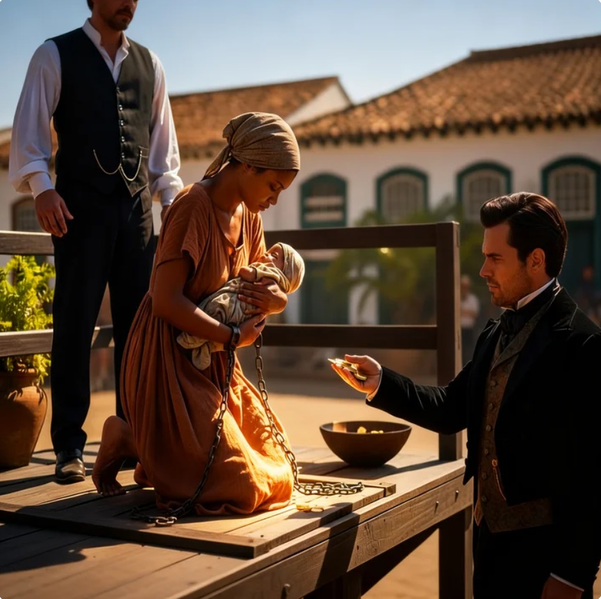 El templete de madera crujía bajo el peso de los hombres que se acomodaban para observar la subasta. El aire estaba lleno de polvo, sudor y murmullos impacientes. En medio de aquel escenario de crueldad estaba Guadalupe, arrodillada, con el cuerpo temblando y el vestido pegado a la piel por la sangre y el sudor.