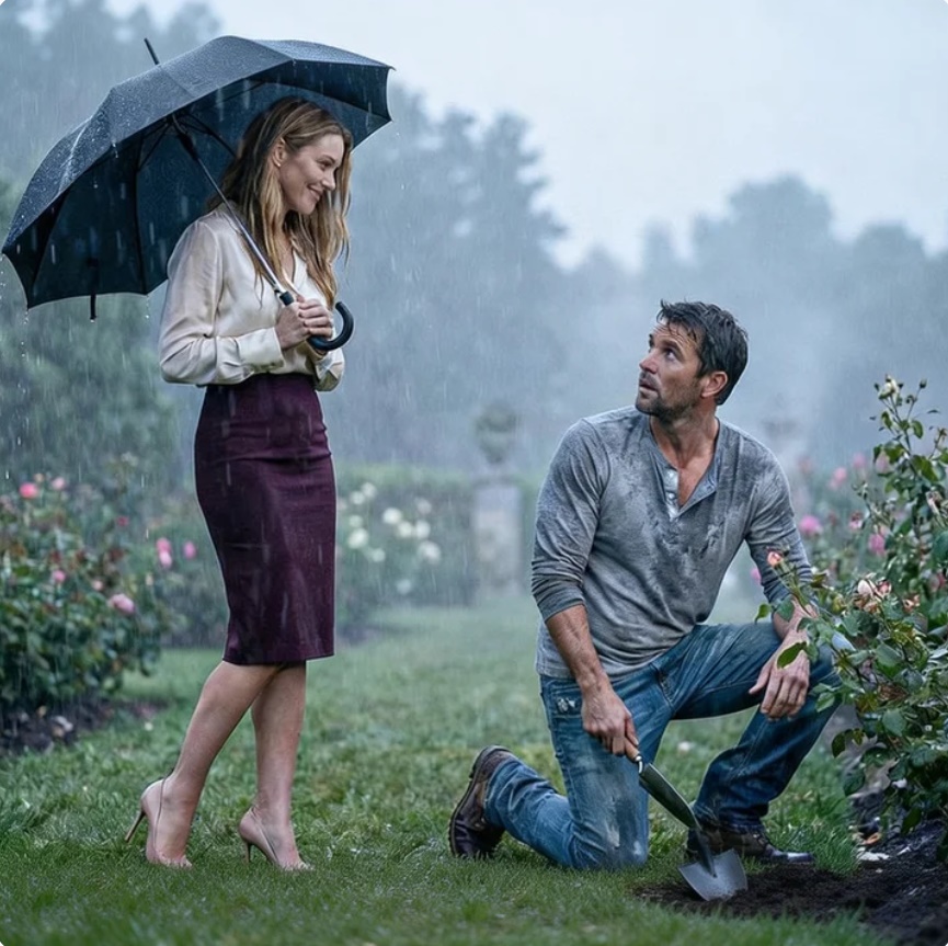 Una media sonrisa apareció en la boca de Elías. Catalina, sin pensarlo demasiado, se inclinó y sostuvo el paraguas sobre él mientras terminaba de cubrir las raíces con plástico.