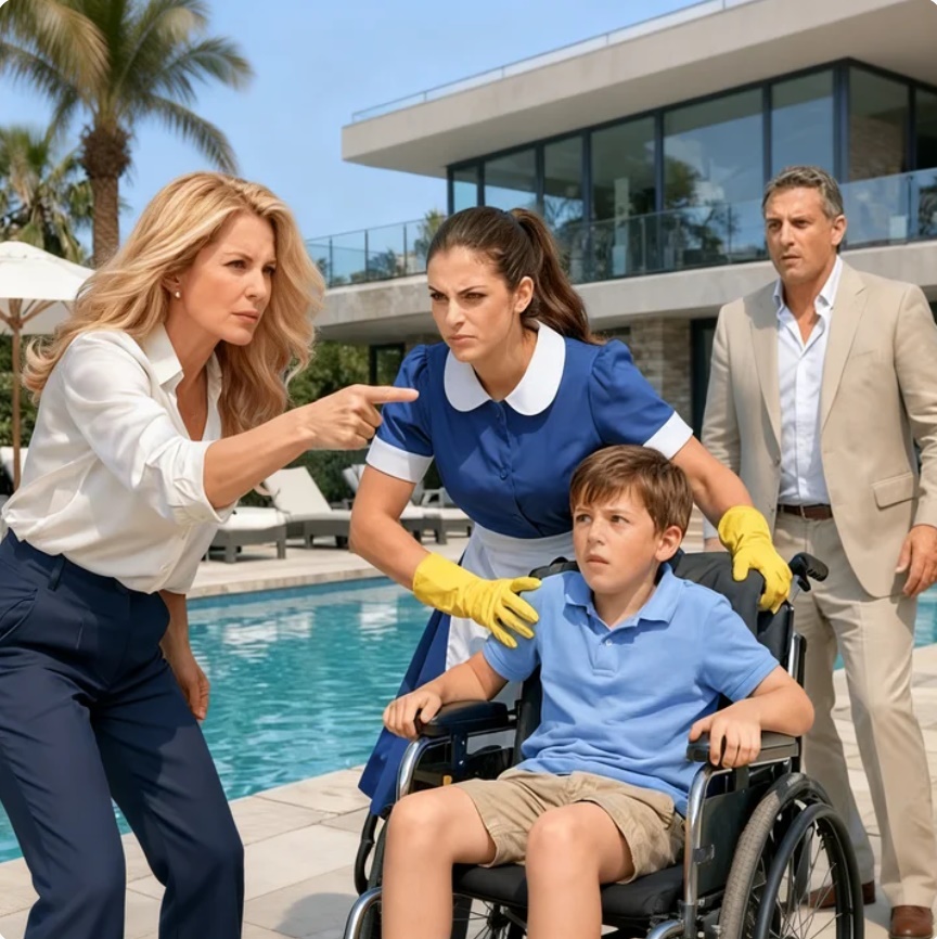 La voz de Viviana atravesó el aire junto a la piscina, afilada como vidrio roto. El niño en la silla de ruedas se encogió, sus manos pequeñas aferradas a los reposabrazos como si quisiera desaparecer.
