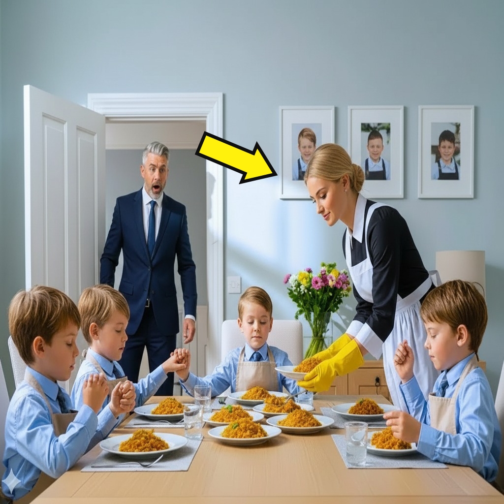La encontró plantada en el marco del comedor, impecable en su traje de Chanel, con un bolso que costaba lo que el sueldo anual de Elena. Se detuvo al ver la escena: arroz en la mesa, niños limpios en pijamas improvisadas, Alejandro sentado a su lado.