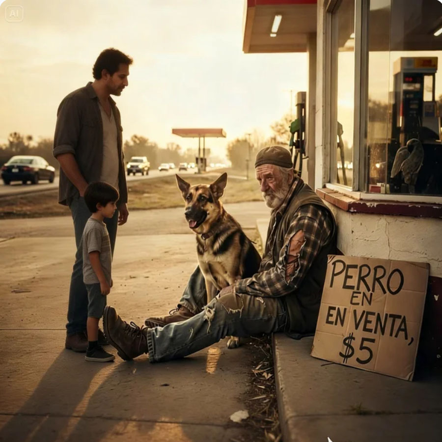 El hombre parecía agotado: viejo, sin afeitar, con la ropa rasgada y cubierta de polvo. A su lado, inmóvil como una estatua, estaba un pastor alemán delgado, de pelaje enmarañado y ojos apagados… pero atentos.