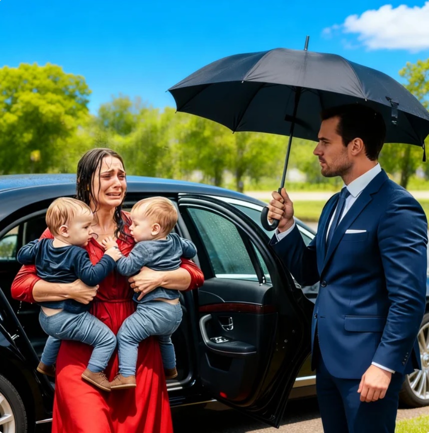 En una parada de autobús sin techo, una mujer joven sostenía a dos niños pequeños mientras la lluvia los empapaba sin piedad. Ella lloraba en silencio, revisando su teléfono una y otra vez. Los gemelos temblaban de frío.