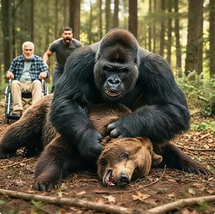 Un cuerpo oscuro cayó entre el oso y la silla de ruedas. Un gorila adulto. 220 kilos de fuerza contenida. Golpeó su pecho con un estruendo que sacudió el aire y lanzó un rugido que parecía venir de algo más antiguo que la montaña misma.