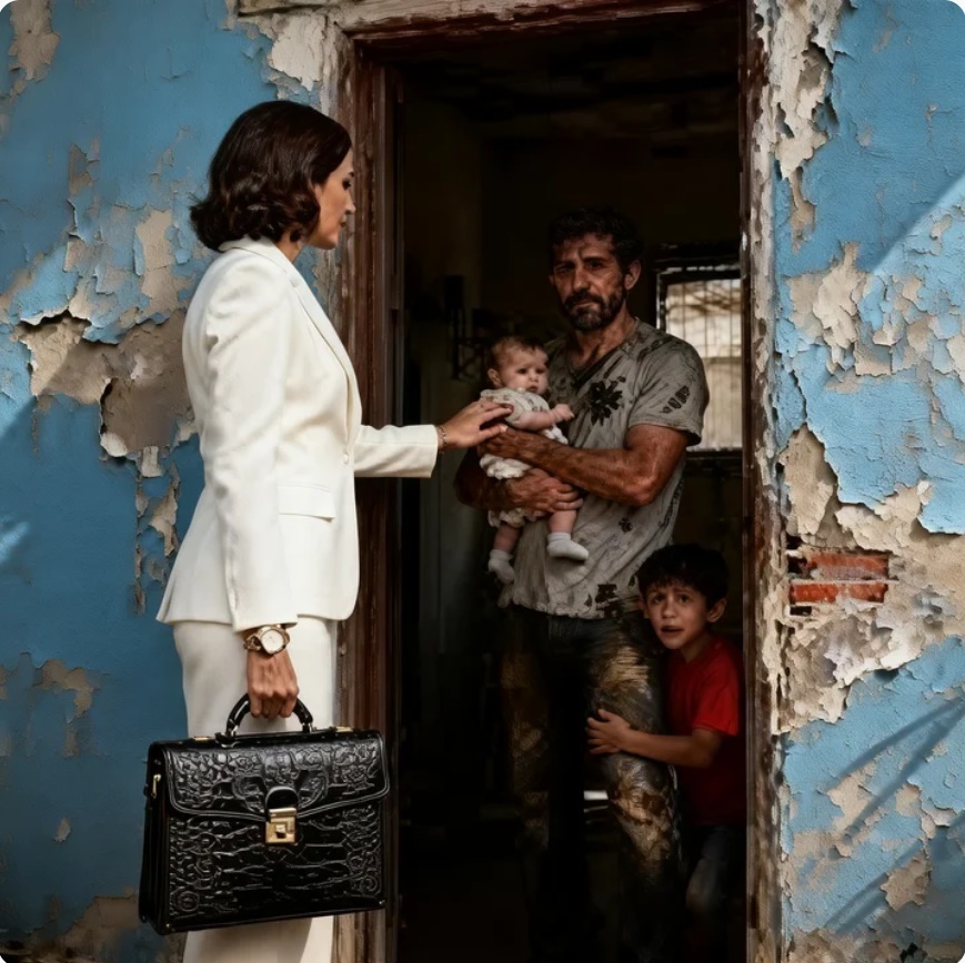 Laura bajó del coche con su traje a la medida y su reloj suizo brillando al sol. Se sintió fuera de lugar, pero lo disimuló levantando la barbilla y caminando con paso firme. Llegó hasta una vivienda azul desteñida, con una puerta de madera agrietada y el número 847 apenas visible.