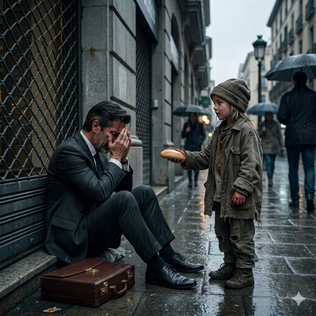 Tú también lloras de hambre”, dijo la pequeña mendiga, ofreciéndole su único pan al hombre que lloraba en la vereda,