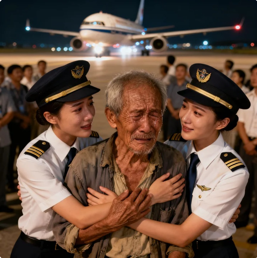 Frente a él, dos jóvenes mujeres vestidas con uniformes de piloto lo sostenían suavemente por los hombros.