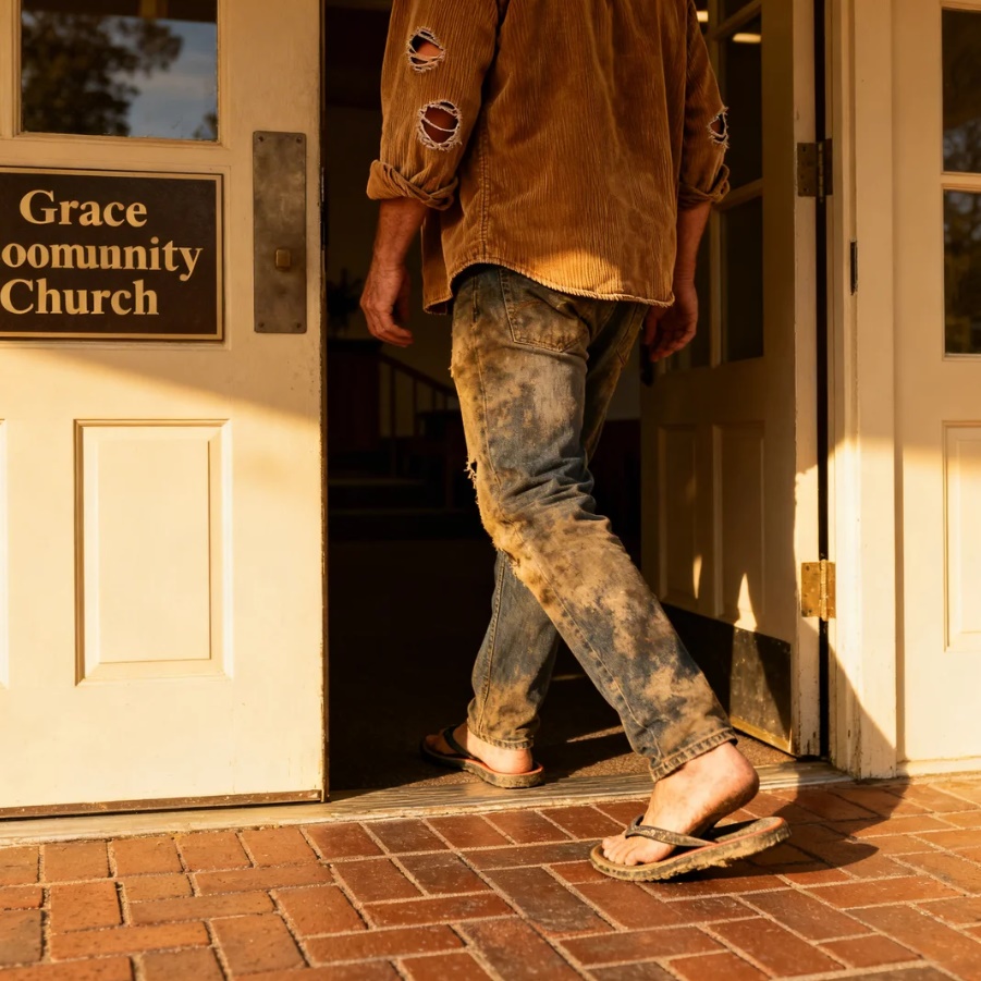 He walked through the front door of Grace Community Church on a Sunday morning, dragging worn flip-flops across